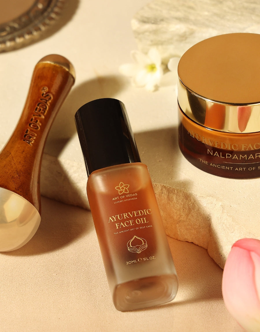 Odkryj istotę prawdziwego ajurwedyjskiego piękna dzięki naszemu Ayurvedic Beauty Ritual Kit, połączeniu starożytnej tradycji i świadomej pielęgnacji siebie. Ten starannie dobrany zestaw zawiera nasz najwyższej jakości Ayurvedic Face Oil oraz ręcznie wykonany Mini Kansa Wand, inspirowany wielowiekowymi praktykami ajurwedyjskimi.