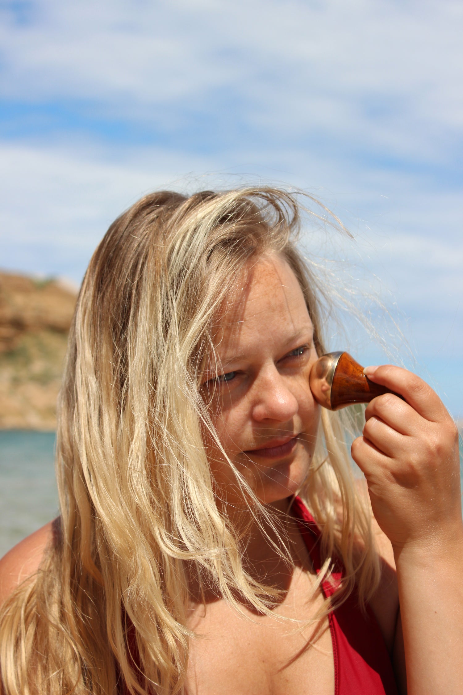Delikatnie przesuwaj Mini Kansa Wand wokół okolic oczu, koncentrując się na pod oczami, kości brwiowej i zewnętrznych kącikach.