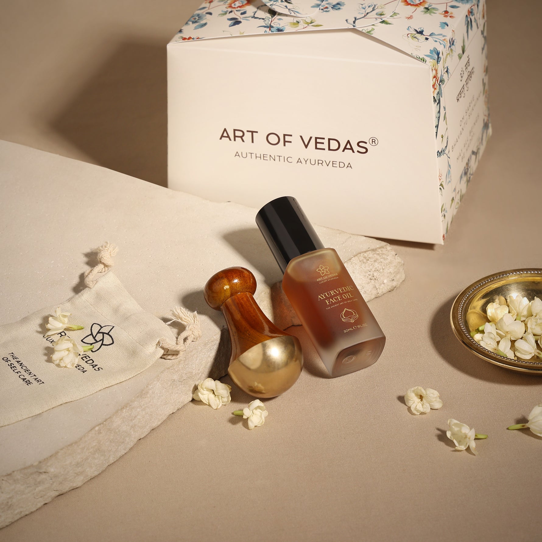 Ayurvedic Face Oil, joka on rikastettu kasviuutteilla ja yrteillä, imeytyy syvälle raviten ja tukien ihosi luonnollista uudistumisprosessia. Se auttaa tasapainottamaan doshat (energeettiset voimat ayurvedassa) tuoden esiin ihosi terveimmän tilan, vähentäen epätasaisen sävyn, kuivuuden ja hienojen juonteiden näkyvyyttä.